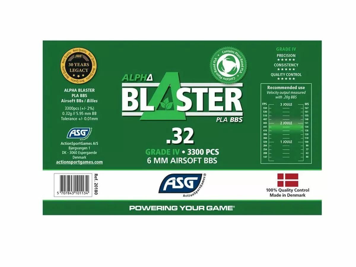 La bouteille Alpha Blaster PLA ASG 0.32 g contient 3300 billes Airsoft biodégradables au calibre standard 6 mm (5,95 mm +/- 0,01 mm). Conçues pour répondre aux exigences des terrains imposant l’usage de munitions BIO, ces billes offrent un grammage supérieur adapté aux configurations recherchant davantage de stabilité en vol.