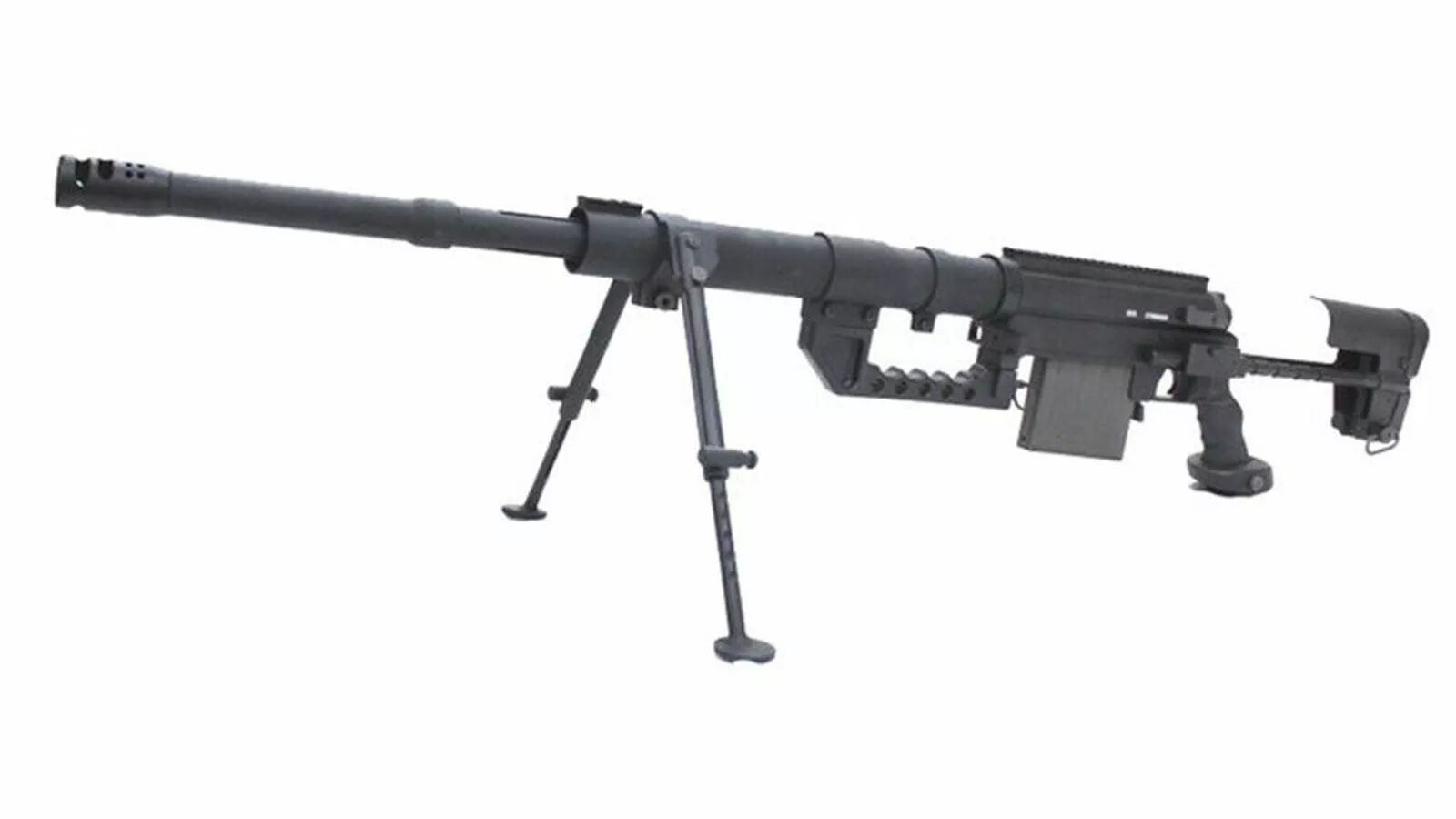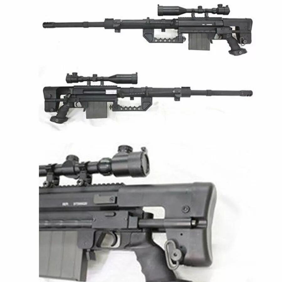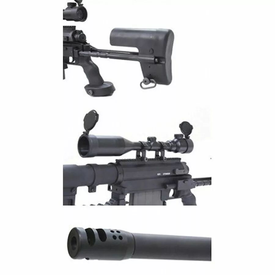 Avec une longueur variable entre 125 cm (crosse repliée) et 141 cm (crosse déployée), et un poids d’environ 7,1 kg, ce fusil impose le respect. Le système spring bolt action délivre une puissance d’environ 380 fps (0,20 g), idéale pour des tirs longue distance et une bonne pénétration. Son canon de précision (6,03 mm) couplé à un hop-up réglable permet un tir stable et performant, même à longue portée.