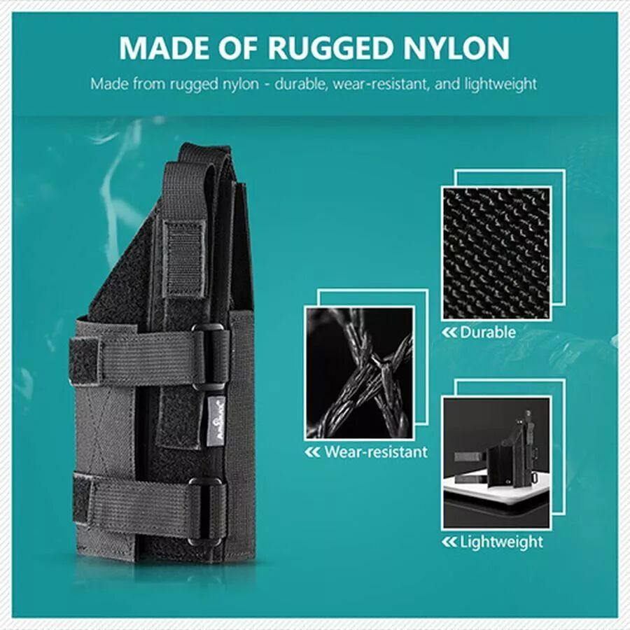 Ce modèle est conçu en nylon synthétique léger mais très résistant, ce qui lui permet de supporter un usage intensif et les contraintes tactiques (terrain, airsoft, entraînement). Le système de fermeture par bouton-pression (thumb break) garantit un maintien sûr de l’arme tout en permettant un dégainé rapide. Le holster est réglable via des sangles et un velcro afin d’ajuster la taille du holster au pistolet.