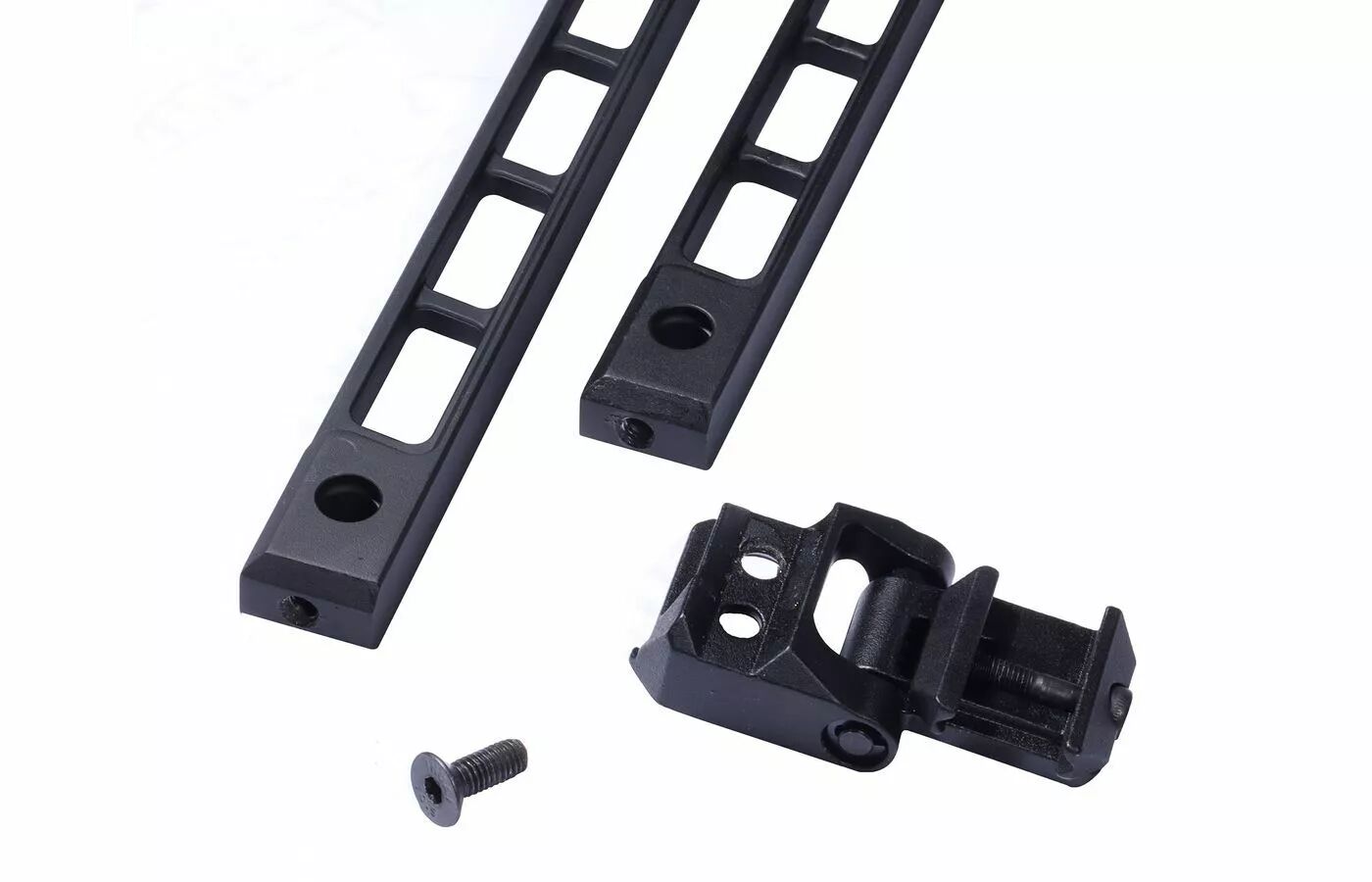 Le kit est livré avec un montage RIS (Picatinny) repliable, déjà installé sur la première crosse. Ce montage permet de replier la crosse sur le côté de la réplique afin de réduire l’encombrement. Le système est conçu pour accueillir indifféremment l’une ou l’autre des deux crosses fournies.