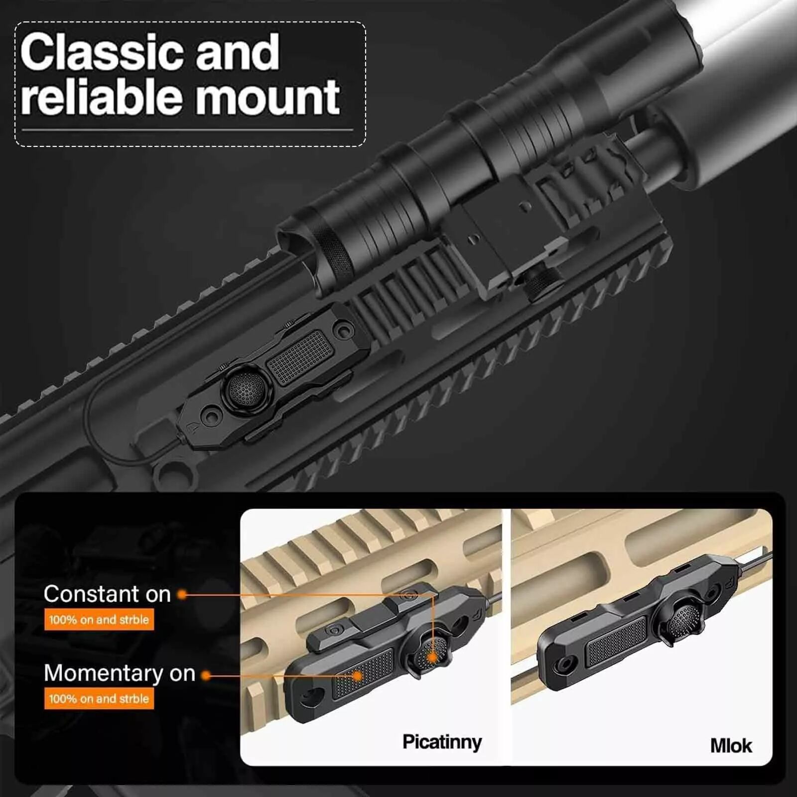 Grâce à son double système de montage, la Skywoods L7019A peut être fixée sur rail Picatinny (RIS) ou sur système M-Lok. Elle s’adapte ainsi à la majorité des répliques airsoft, carabines, fusils de chasse et plateformes tactiques modernes. Livrée avec un connecteur déporté (switch), elle permet un allumage instantané sans avoir à déplacer vos mais et lâcher la poignée, idéal pour les interventions ou le tir dynamique.