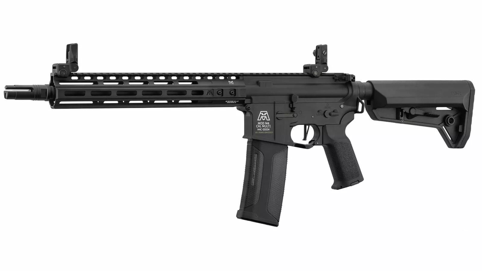 Le modèle 12’’ Gen2 renferme une gearbox V2 renforcée compatible standard M4 AEG. Sa construction interne met ici l’accent sur la régularité cyclique et la robustesse cinématique. Le piston et la tête de piston sont issus d’un design anti-perte d’énergie sur la phase de reprise, ce qui contribue à maintenir une compression homogène même après de longues sessions de jeu. Les engrenages en acier, combinés au système ETU Gen2 (puce de pilotage de détente électronique), gèrent des cycles plus propres et plus rapides qu’un contacteur mécanique classique, avec une lecture de détente plus régulière et un retour de course toujours net. Cette électronique intégrée participe à la bonne protection du moteur et à une cadence de tir constante, avec la batterie 9,6 V qui équipe le pack « carabine prêt à jouer ».