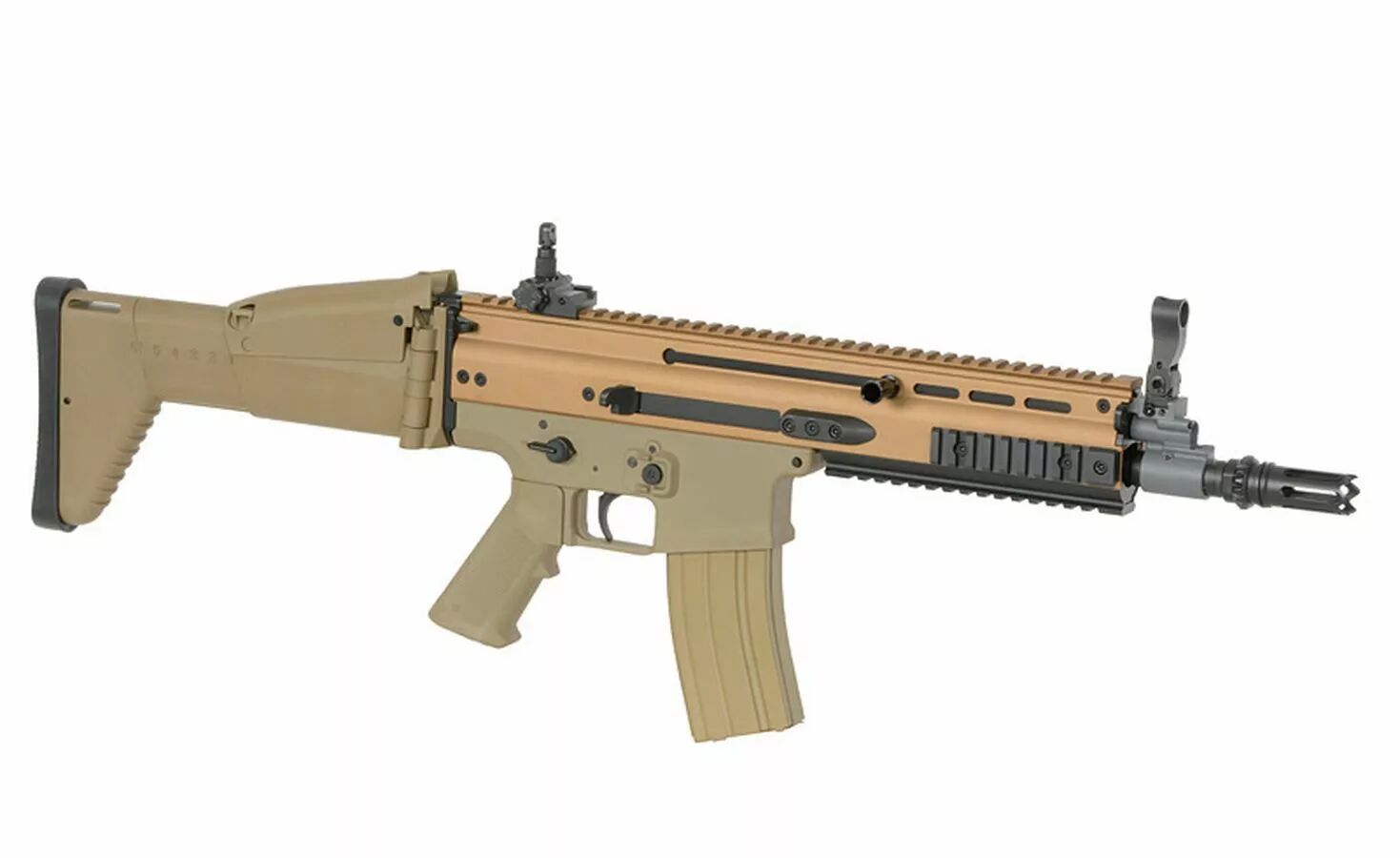Le FN SCAR-L (Special Operations Forces Combat Assault Rifle) a été développé pour répondre aux exigences des unités d’élite recherchant modularité, robustesse et performance. Son design moderne et sa conception ergonomique en font une référence dans l’univers militaire comme dans celui de l’airsoft.