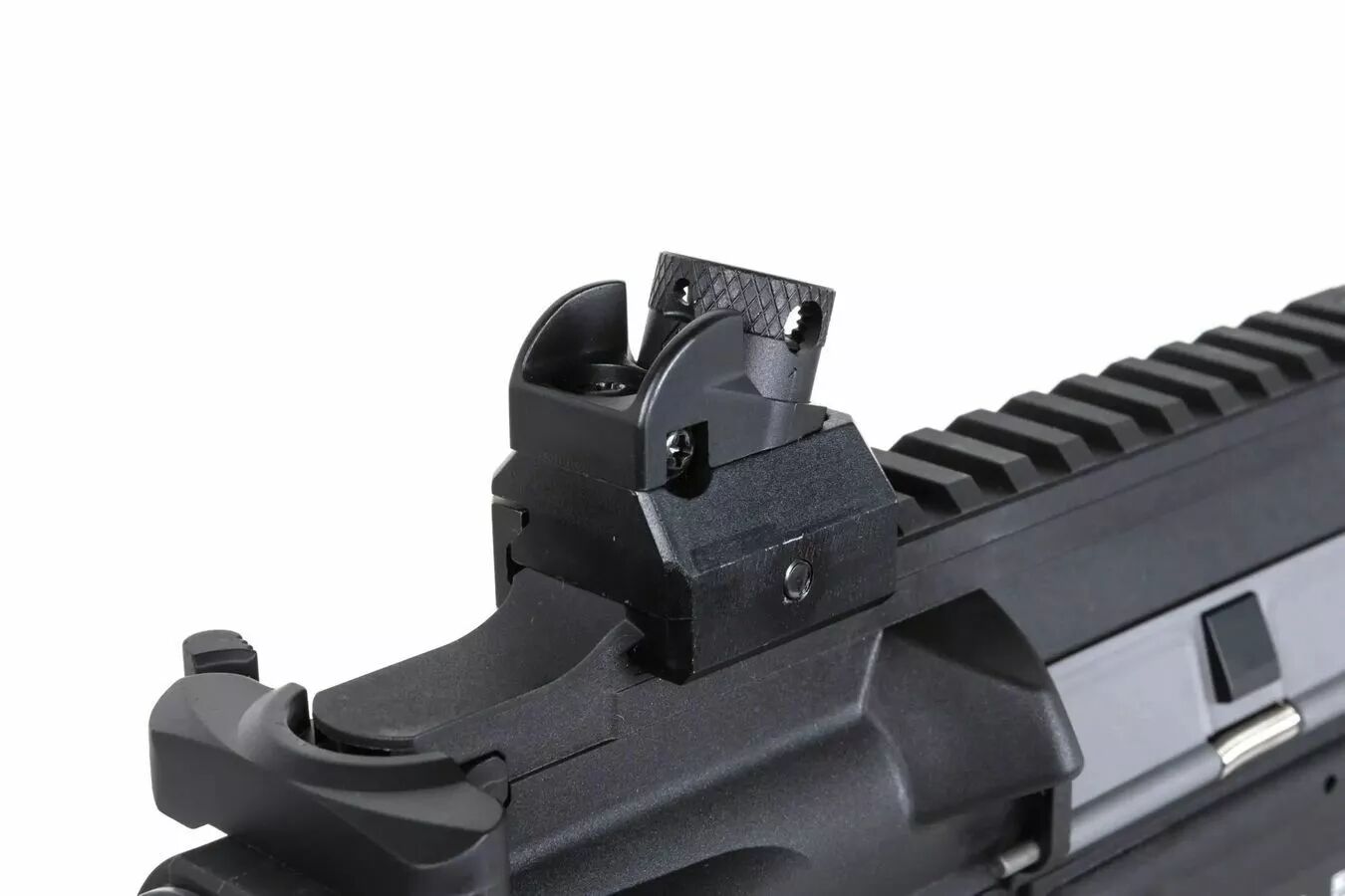 Elle dispose d’une crosse extensible à 6 positions avec talon de crosse en caoutchouc, permettant d’adapter la longueur selon votre style de jeu. La poignée pistolet est ergonomique pour un bon confort de prise en main. Pour les accessoires, la partie avant offre quatre rails RIS / Picatinny pour l'installation de lampes ou poignées tactiques tandis qu’un rail dorsal permet de monter vos optiques préférés.